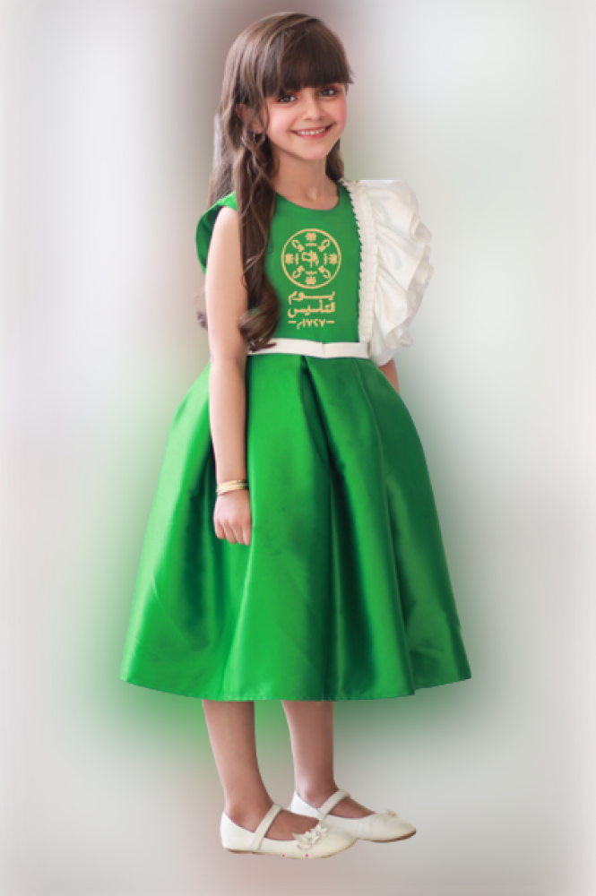 فستان وطني بناتي مطبوع بشعار يوم التأسيسذا المنتج يندرج تحت خيار تجهيز حسب الطلبموديل الفستان —-ميد لنصف الساقنوع القماش —تفتهالقياسات —————من سنه الى _12سنه