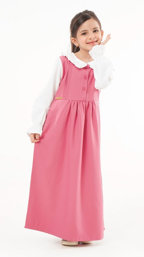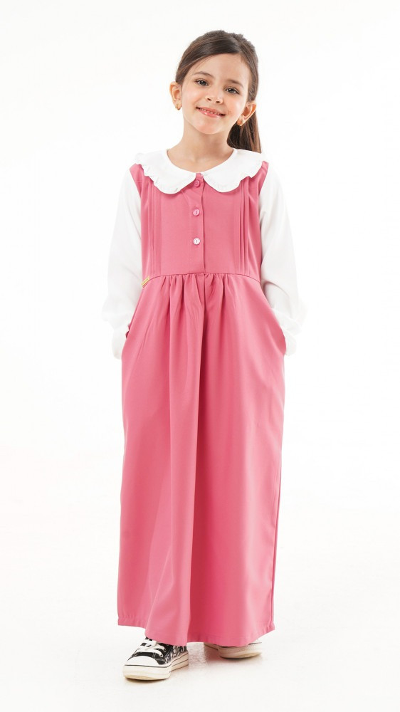 مريول ابتدائي بلون وردي من خامة كريب مصمم من الامام بقصة معاكسة مع مطاط بحوانب الخصر و كسرتين بالاسفل ا لسهولة الجلوس مع وجود جيب جانبيمن الخلف يغلق بسحاب مخفي